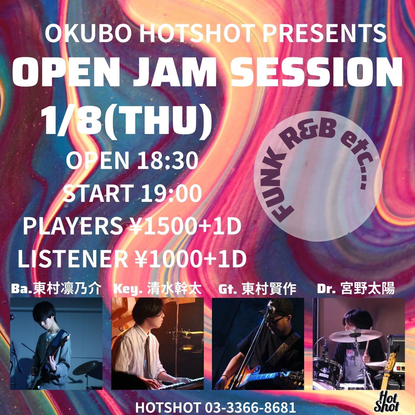 ファンク・R&B好き集合!! 大久保HOTSHOTでファンク・R&Bセッションが毎月第一木曜日に開催! 初心者から上級者まで大歓迎です。 OPEN:18:30/START:19:00 演奏者:¥1,500+1D 見学者:¥1,000+1D